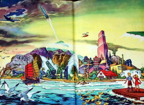In that time before reading, there was much to entertain my child's mind. The names of places in Hollywood like Pig and Whistle or The Brown Derby. I did not understand why it was shaped like a hat when "derby" was what my parents called a horse race. The theatres of Hollywood were a delight. Grauman's Chinese, the Egyptian, the Pantages... exotic places to enter and fall into fantasy the way I would when looking at the flyleaf of our huge set of The Book of Knowledge. Opening the cover showed a drawing of two children drifting ashore atop a volume of the Book itself. They were headed towards a strange land where the shore was cluttered with a house, factory, totem poles, cathedral, an elephant, telescope, Easter Island heads, a volcano, and Mount Rushmore. Above this land, an airplane flew, a helicopter moved, a rocked soared into space and the flying wing flew off the page. A Chinese junk moved towards the beach. This drawing fascinated me for years. I allowed myself to fall into it the way someone planned for some child to do when looking at it. I was gullible to what the world was offering me.